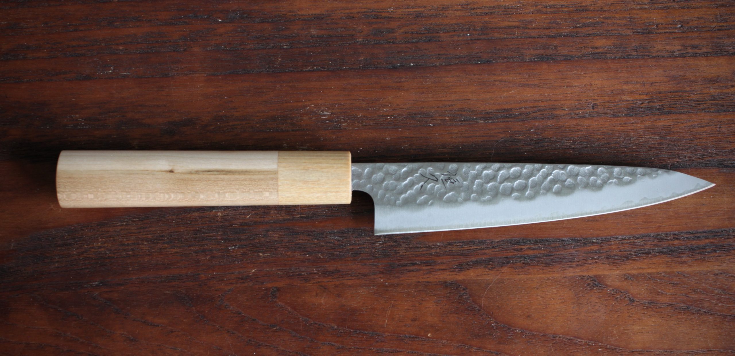 Beautiful little petty knife made from White steel core and stainless cladding. Out of the box it has excellent sharpness, test cutting proved it. makes a nice duo with a chefs knife for most situations. Petty knives are designed for small cutting tasks on a chopping board.